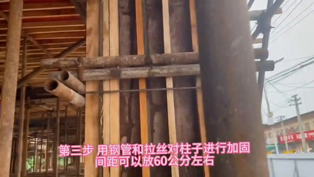 3.用钢管和拉丝对柱子进行加固,间距可以放60公分左右。特别注意下:第三道钢管一定要和架子进行固定,这样对于柱子可以起到很好矫正作用,防止歪斜情况发生。这样做出来的柱子无论垂直度还是平整度都很ok。